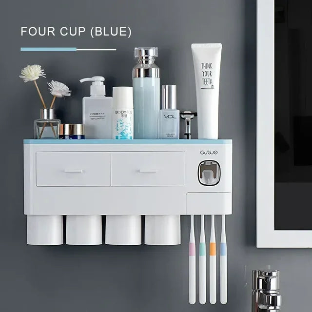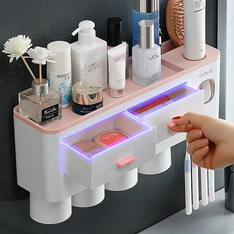 Our famous product The Dental Dock is your all-in-one solution for a clutter-free bathroom! This sleek wall organizer not only dispenses toothpaste with precision but also neatly holds your toothbrush, mouthwash cups, and other essentials, keeping your daily dental routine tidy and efficient.